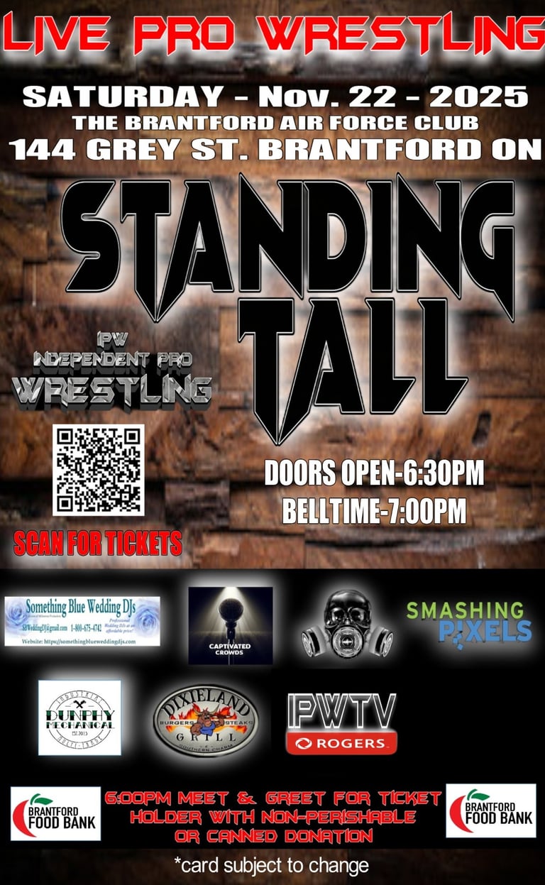 IPW: Standing Tall on Saturday November 22nd Bell Time 7pm - The Brantford Air Force Club - 144 Grey St